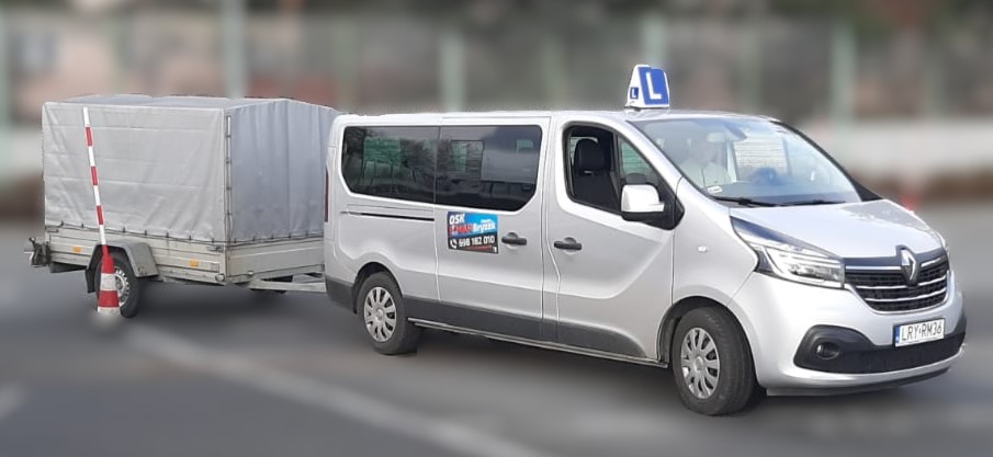 - praktykę: 15 godzin zegarowych (60 minut każda), jazdy odbywają się na zespole pojazdów Renault Trafic z przyczepą.
